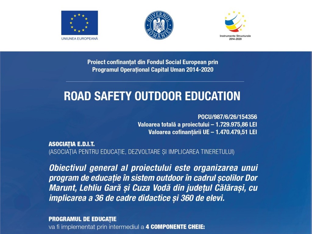 Road Safety Outdoor Education_id154356 Perioada de implementare a proiectului: 25.11.2022-24.11.2023 Obiectivul general al proiectului este organizarea unui program de educație în sistem outdoor în cadrul a 3 unități de învățământ din județul Călărași, cu implicarea a 36 de cadre didactice și 360 de elevi. Educație rutieră și prim ajutor Educație rutieră și prim ajutor Școla […]